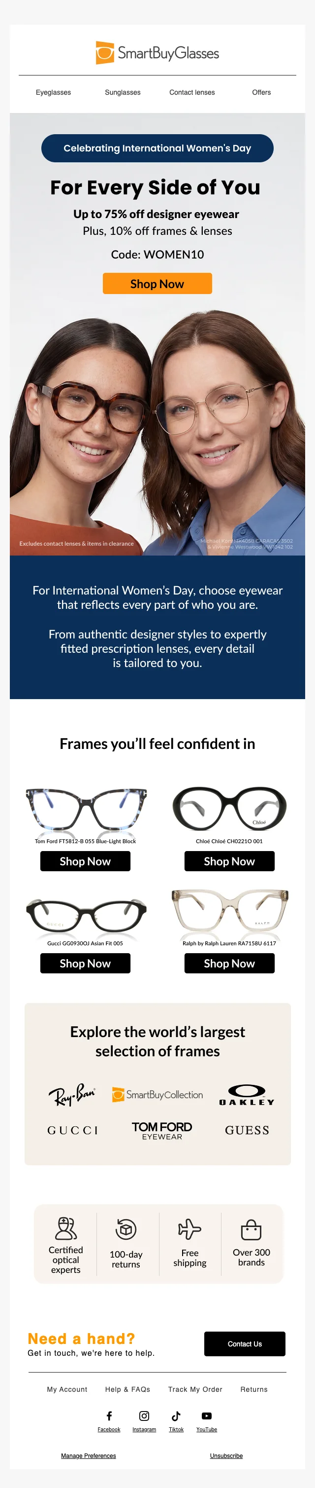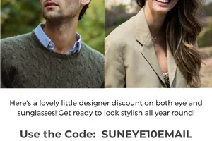 Save 10% across the site on all frames and lenses, lowering the price of prescription glasses and sunglasses. Ideal for upgrading frames or ordering replacement lenses; discount is applied at checkout for a limited time.